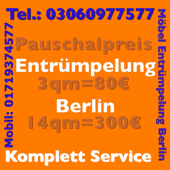 Türmen sich im Wohnung, Abstellraum oder in anderen Räumen jeden Menge Sperrmüll, alte Möbel anderweitige Gegenstände, die künftig nicht mehr benötigt werden, muss eine gründliche Abholung Möbelentsorgung Inneneinrichtung Einrichtungsgegenstände Berlin Charlottenburg her. Wir bietet alle erforderlichen Arbeiten zum günstigen Komplettpreis. Im Wohnungsauflösung Angebot enthalten sind alle Leistungen von der Anfahrt über das Ausräumen bis hin zum Abtransport und der Abholung Möbelentsorgung Inneneinrichtung Einrichtungsgegenstände Berlin Charlottenburg beim BSR. Buchen Sie uns - Sperrmüllabholung sind mit unserem erstklassigen Service, jede Menge Praxiserfahrung viel Können im gesamten Raum für Ihnen da!